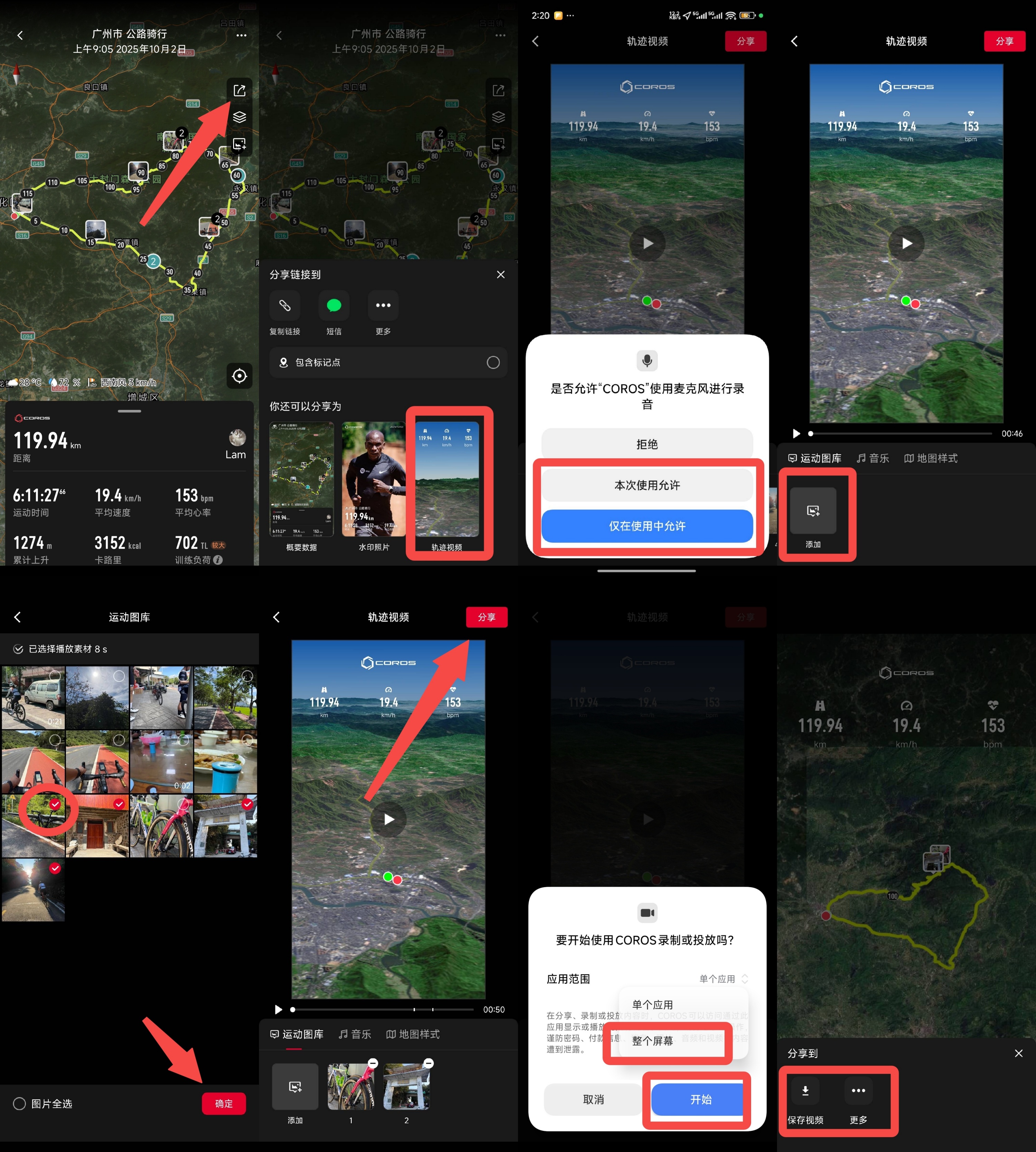 安卓手机:运动记录右上角分享箭头——轨迹视频——选择允许——添加——选择图片与视频——分享——“整个屏幕”开始——保存到相册或分享到第三方APP