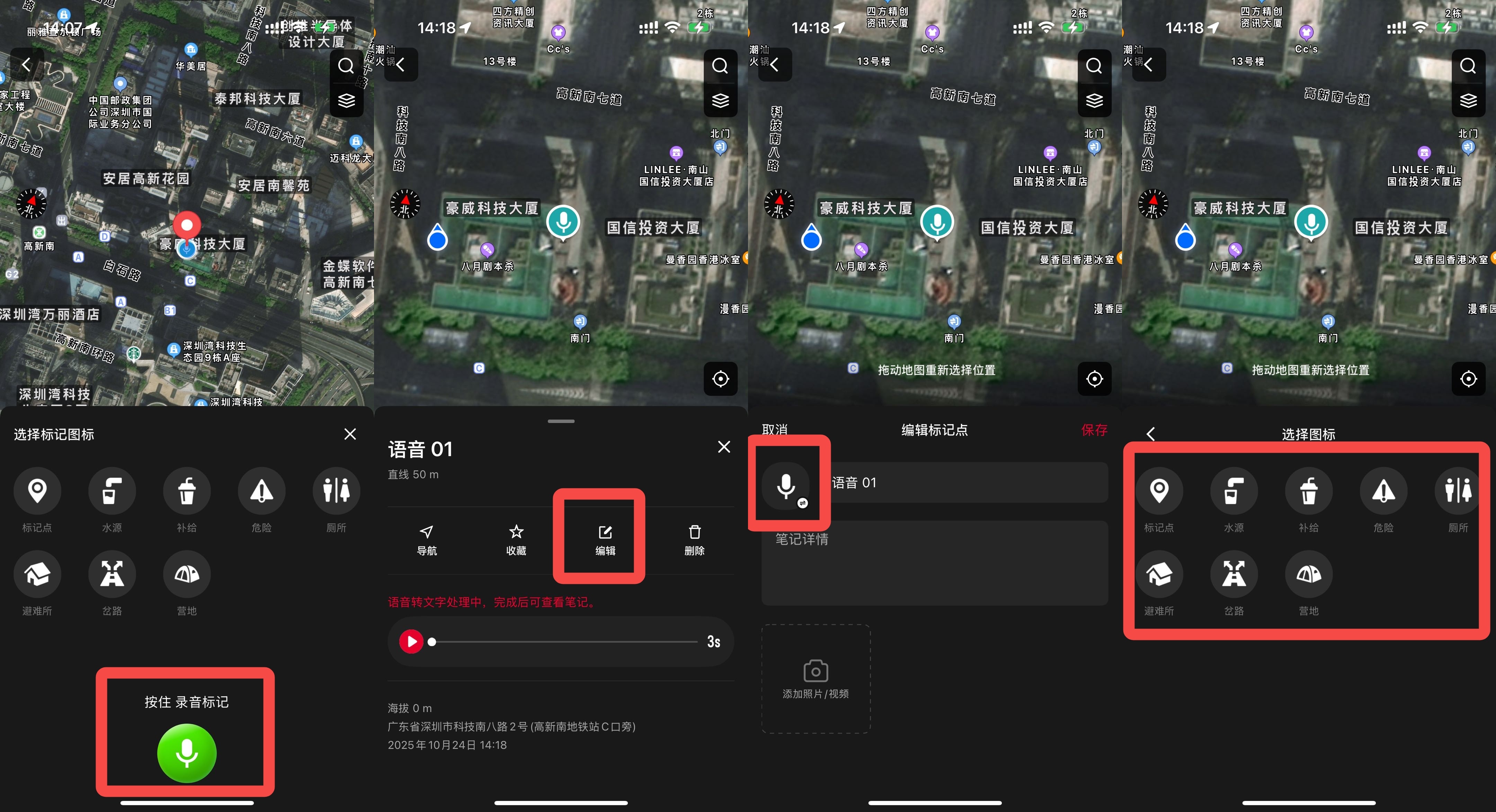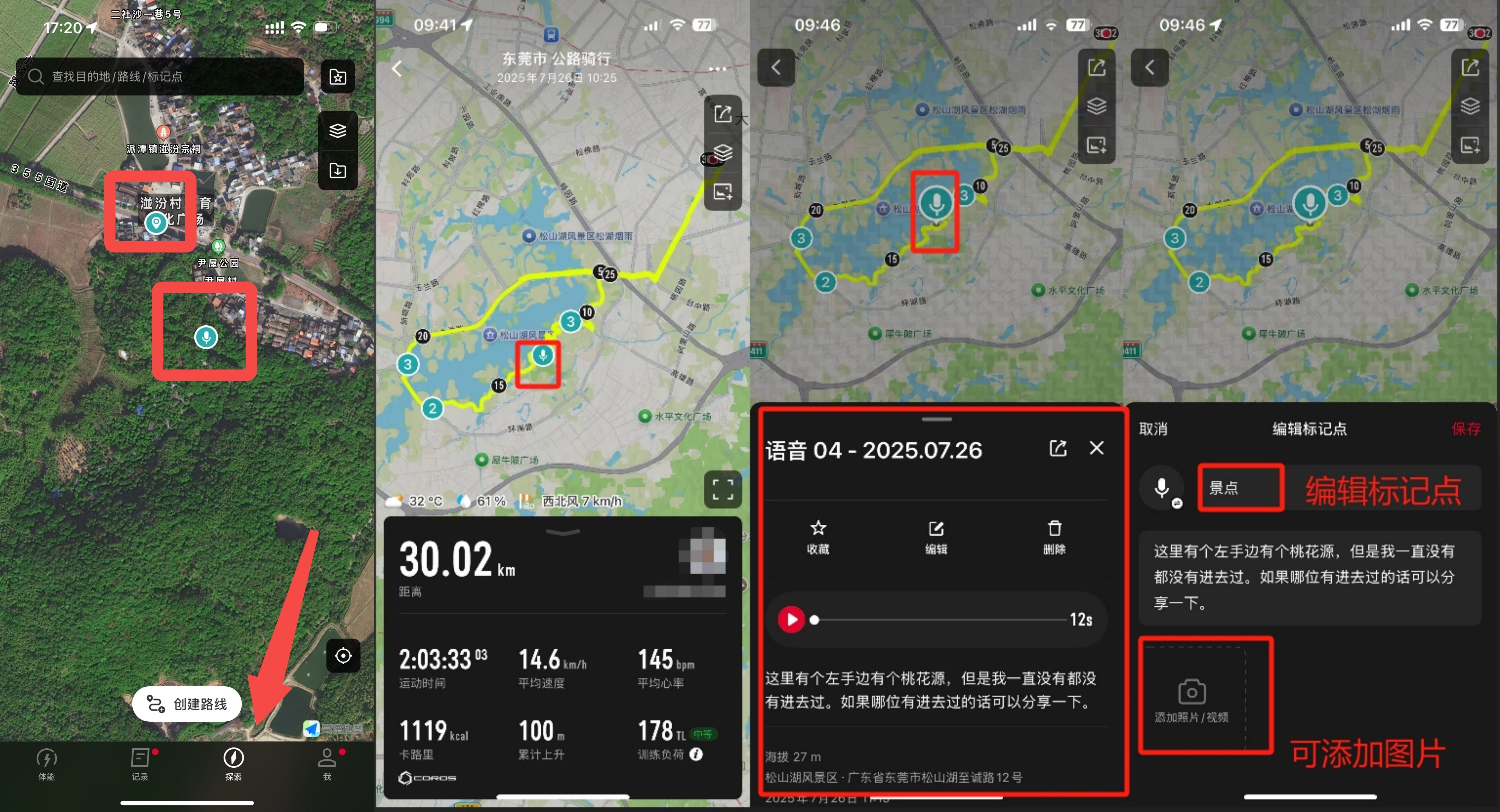 APP点击探索页面/运动记录轨迹图,点击图标后可对标记点进行编辑与添加图片,此前记录的语音也会被识别成文字