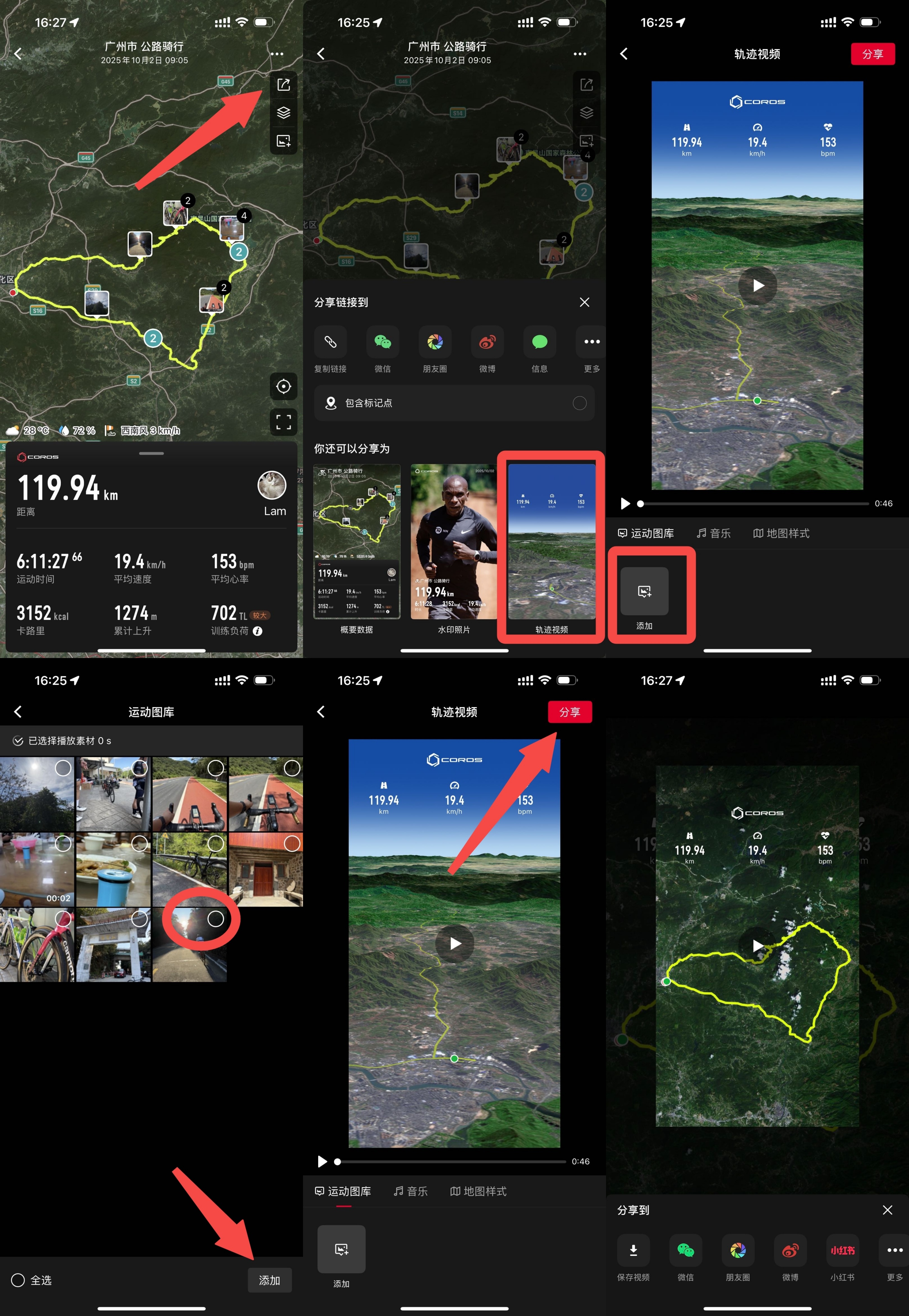 iPhone手机:运动记录右上角分享箭头——轨迹视频——添加——选择图片与视频——分享——保存到相册或分享到第三方APP