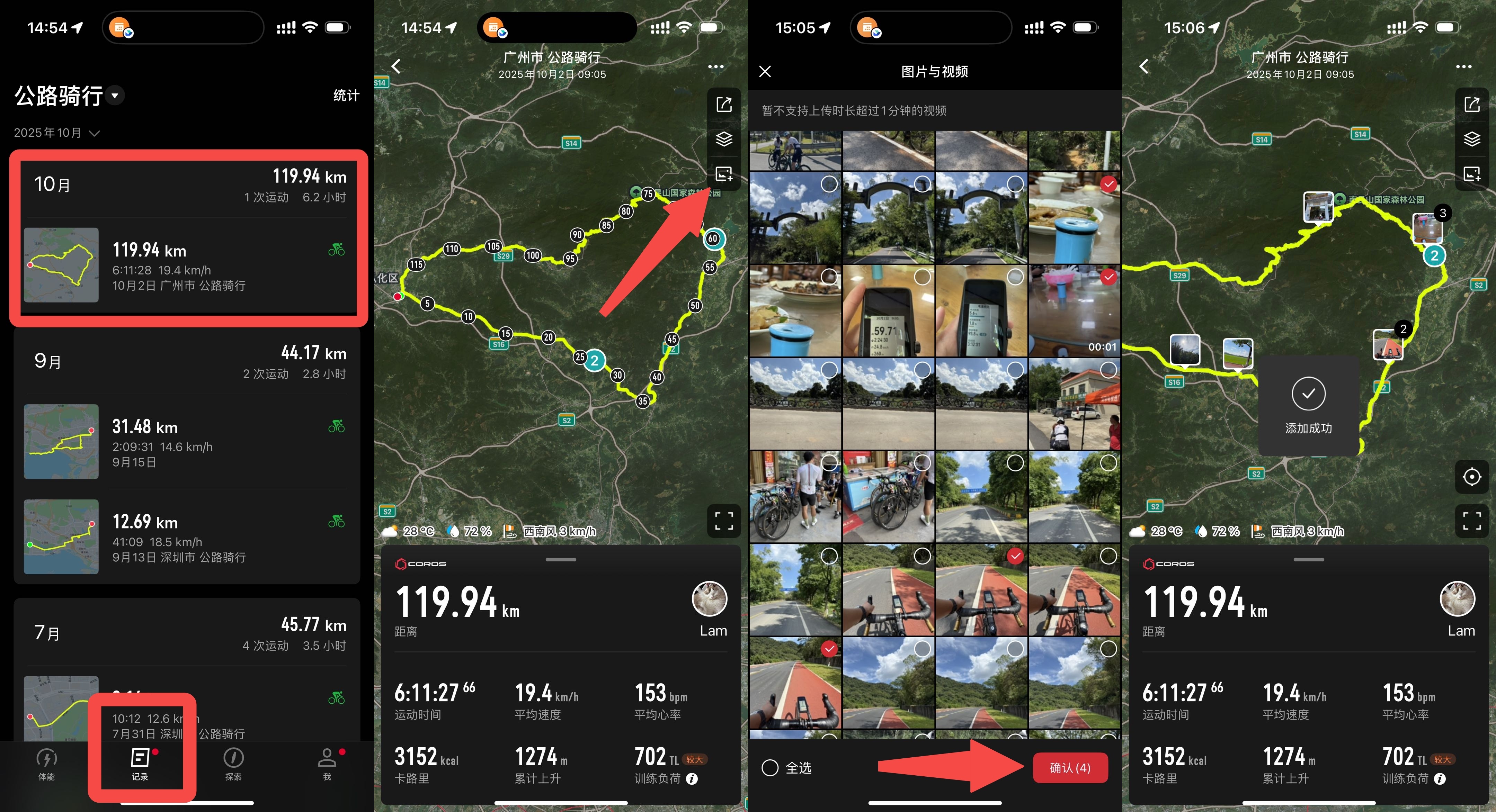 COROS APP点击“记录”页面——选择对应的运动记录——右上角图片符号——选择需要插入的图片与视频