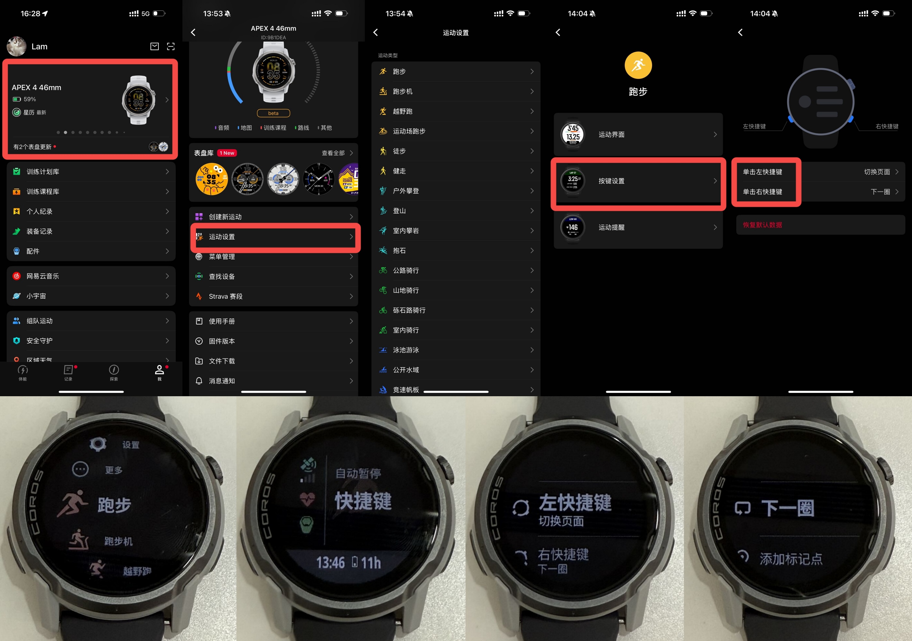 手表端:任意运动模式,如跑步——滚动旋钮按键——快捷键——左下/右下快捷键——进行设置