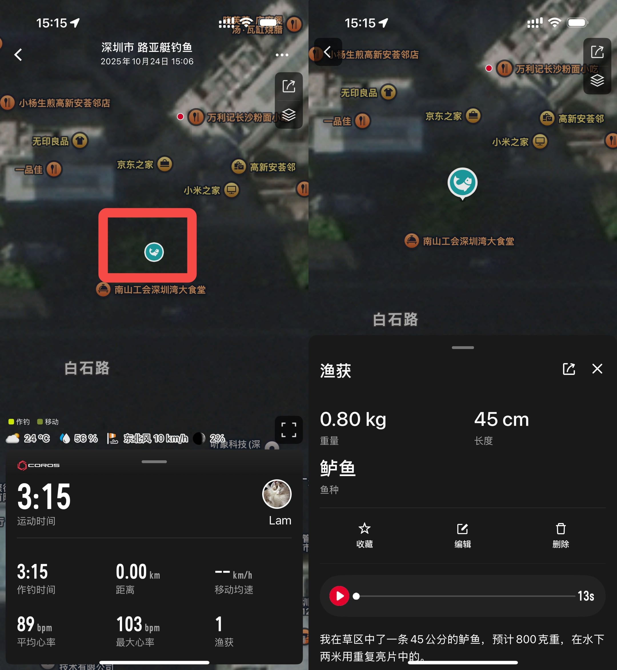 手表打开钓鱼模式——长按返回键——标记点——鱼获——添加录音(如:我在草区中了一条45公分的鲈鱼,估计800g左右,在水下2米用复合亮片中的)运动结束后,APP内可以识别鱼种、尺寸重量,未来还会加入更多关键信息