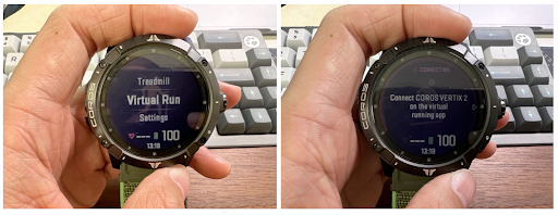 2. ウォッチで「トレッドミル」を選択し、「バーチャルラン」を選びます。Zwiftまたは他のプラットフォームにウォッチが検出されるまで待ってから開始してください。