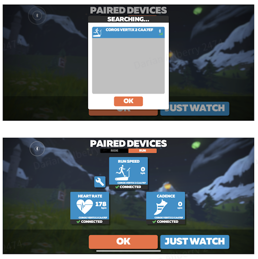 4. 「OK」を押してランを開始します。アバターが画面に表示されたら、COROSウォッチでもスタート操作を行ってください。ラン終了時は、まずアプリ側(例:Zwift)でアクティビティを終了します。Zwiftは自動的にデータをサーバーへアップロードします。その後、COROSウォッチで停止し、アクティビティを保存してください。なお、アクティビティは2つ記録されます。1つはZwift側で作成される記録(こちらはCOROSアプリには表示・保存されません)、もう1つはCOROSアプリに保存される記録です。