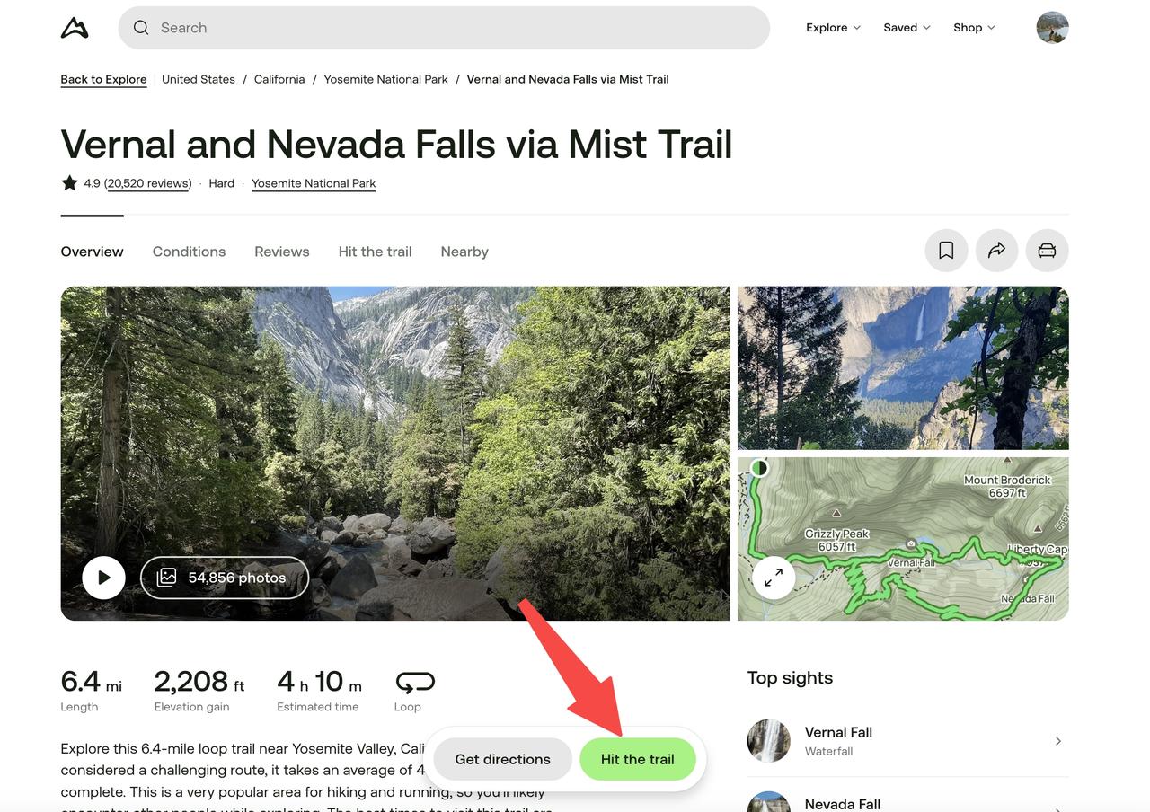 - ダウンロードしたいルートを開きます。画面下部にある緑色の「Hit the Trail」ボタンをクリックします。