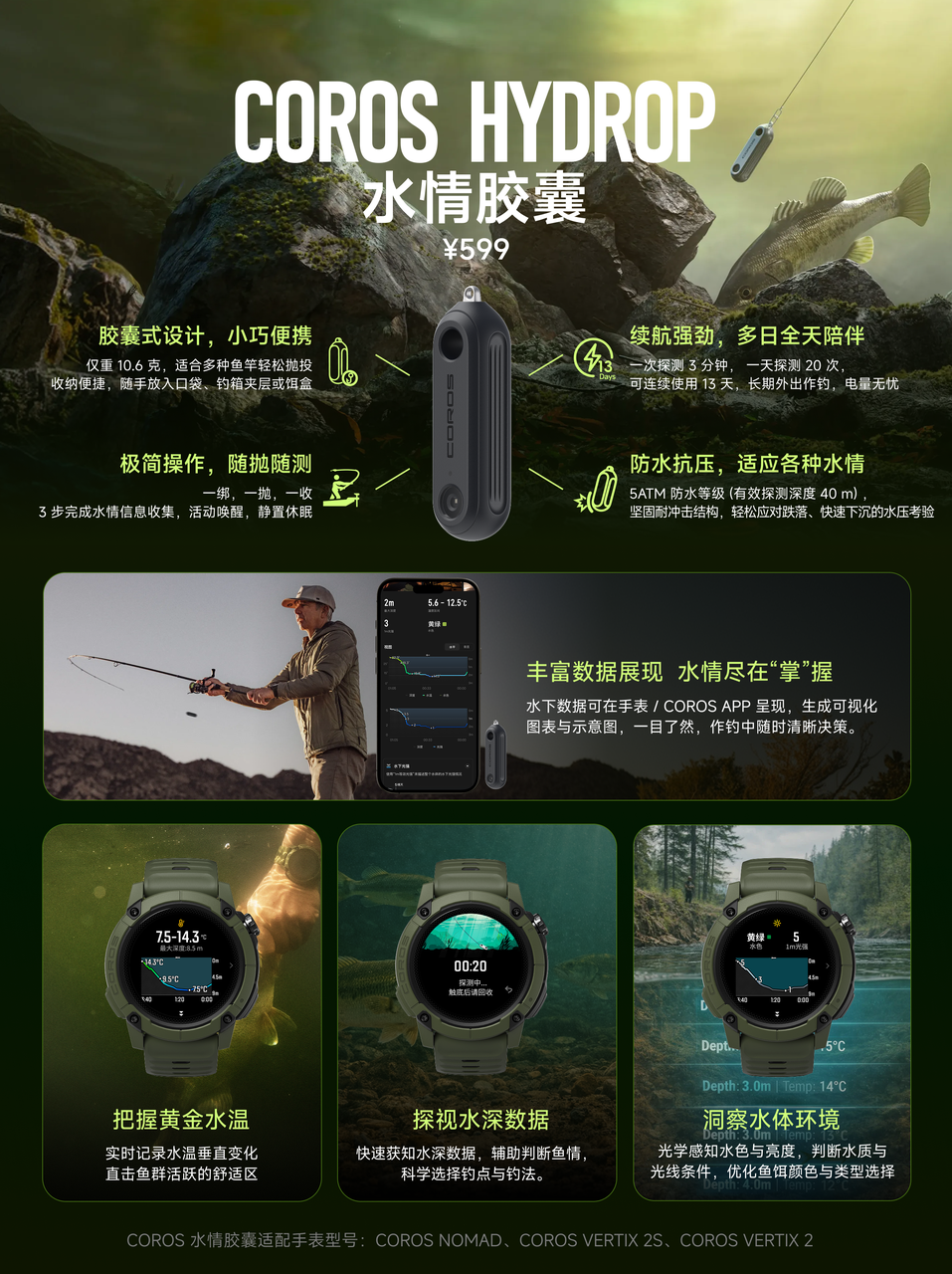 需要配合NOMAD、VERTIX 2、 VERTIX 2S 有钓鱼功能的高驰手表使用;其它品牌的手表不支持连接水探胶囊;水情胶囊也不能单独配合COROS APP直接获取数据。