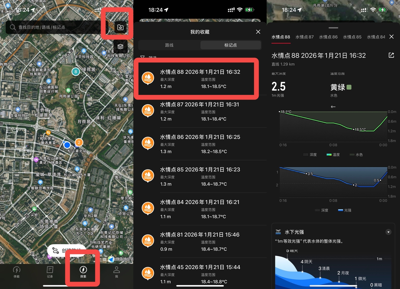如果是在“工具包”探测,APP点击探索页面——右上角文件夹符号——标记点,可以看到探测数据