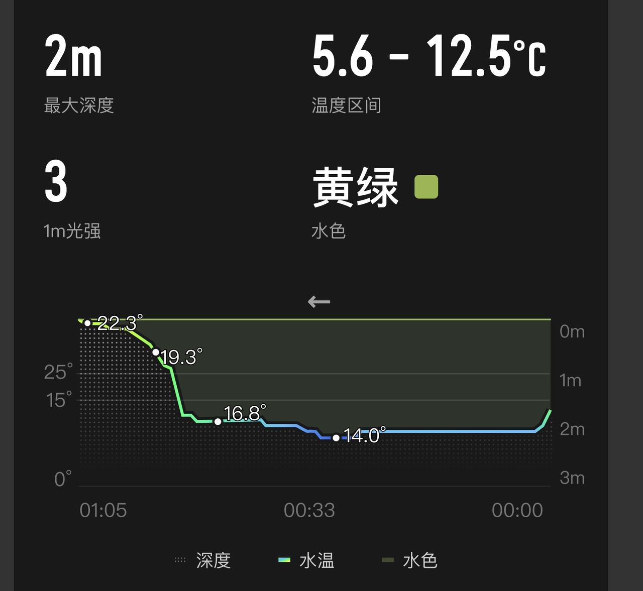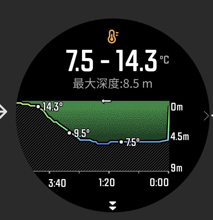 8.3、在概要页按确定键后滚动旋钮或点击屏幕后左右拖动,可查看各位置深度、温度等分时数据。