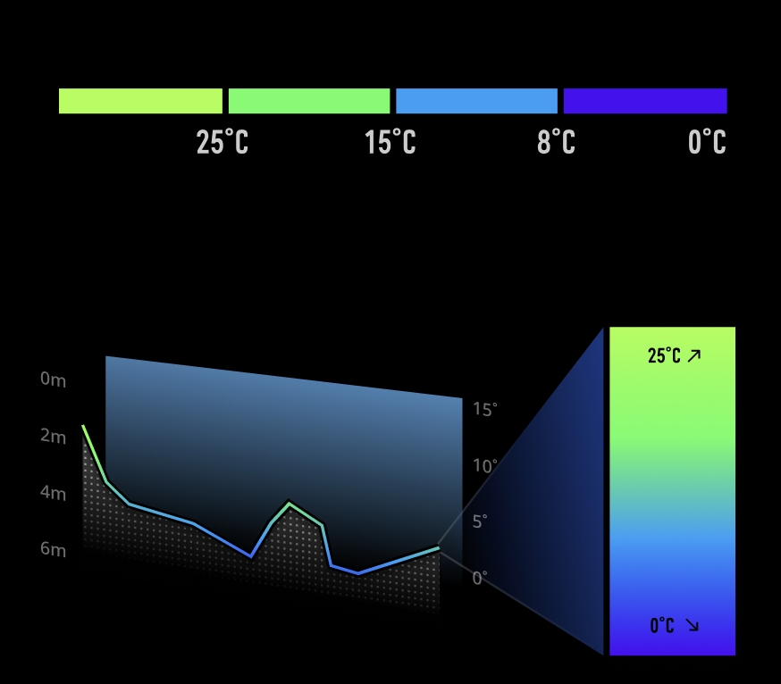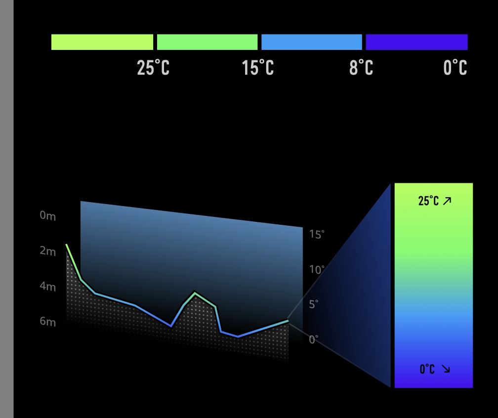 9、水体温度分层的颜色含义:(如图,温度曲线:0,8,15,25度为临界温度 ,分为四个颜色段,曲线上点为温度值。)