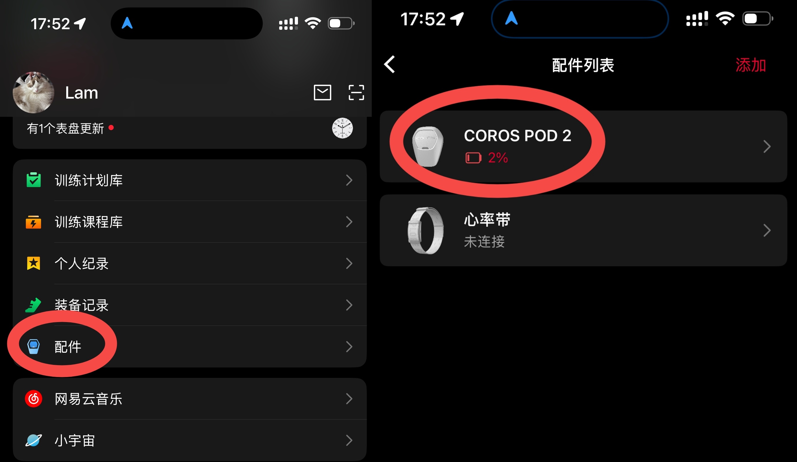 方法二:从 COROS APP 的「配件」列表查看电量。