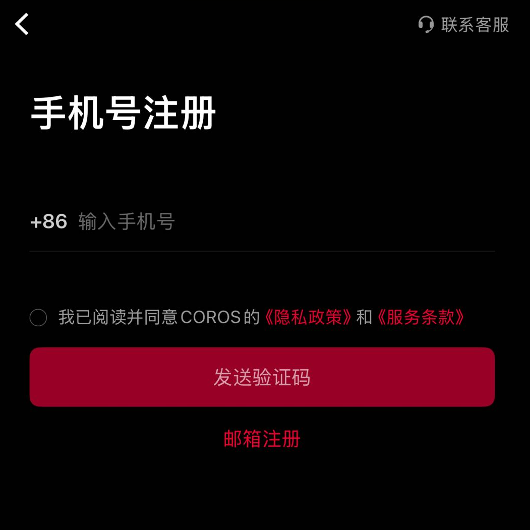 首次使用,您可选择手机号注册账号。或者选择注册邮箱账号,便未来同步COROS的运动数据至第三方运动台。