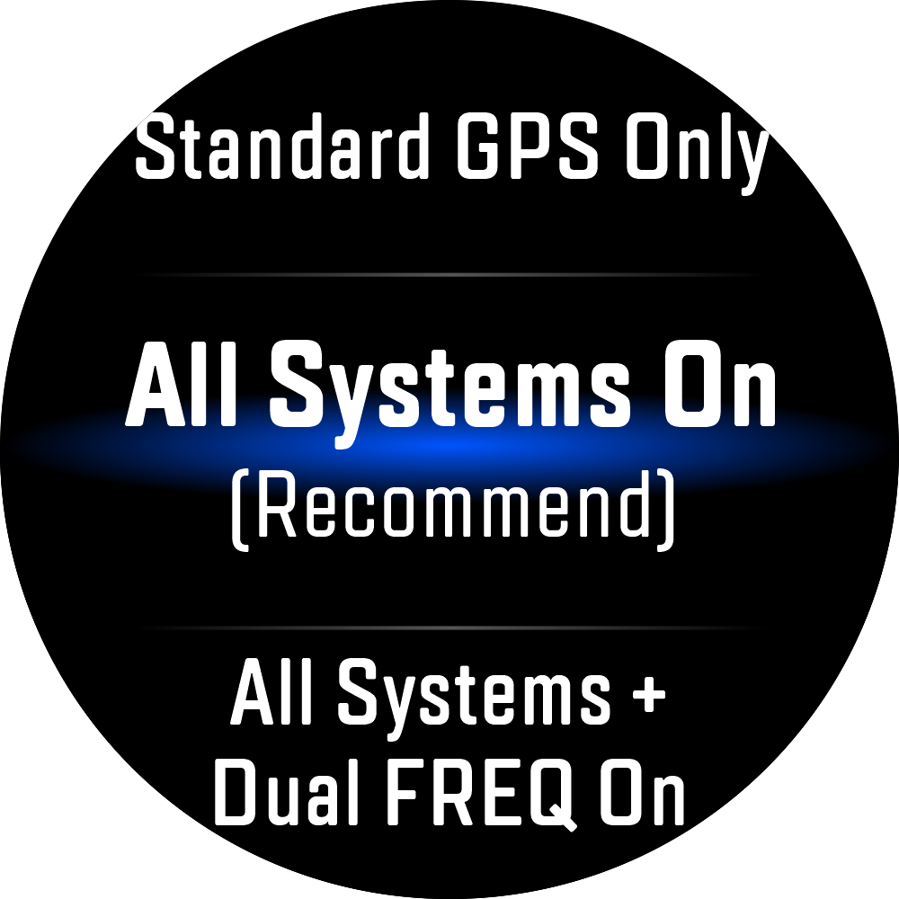 デバイス上で、「設定」>「システム」>「衛星システム」に移動して、衛星モードを変更します。ほとんどのシナリオでは「全システム」をオンにすることが推奨されますが、強い衛星信号を取得しにくい地域(峡谷、森林、または高層ビルがある都市部など)を移動する場合は、二周波システム(DURA、PACE 3、PACE 4、PACE Pro、COROS NOMAD、APEX 2 Pro、APEX 4、VERTIX 2、VERTIX 2Sで利用可能)に切り替えることをおすすめします。